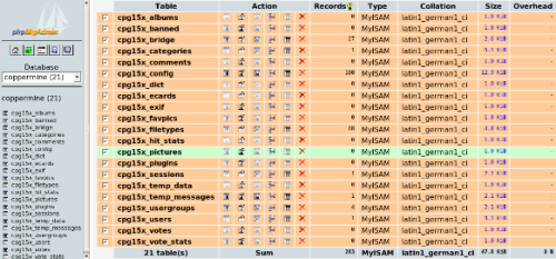 <?php // add the mysql connection stuff here DROP TABLE `cpg15x_albums`, `cpg15x_banned`, `cpg15x_bridge`, `cpg15x_categories`, `cpg15x_comments`, `cpg15x_config`, `cpg15x_dict`, `cpg15x_ecards`, `cpg15x_exif`, `cpg15x_favpics`, `cpg15x_filetypes`, `cpg15x_hit_stats`, `cpg15x_pictures`, `cpg15x_plugins`, `cpg15x_sessions`, `cpg15x_temp_data`, `cpg15x_temp_messages`, `cpg15x_usergroups`, `cpg15x_users`, `cpg15x_votes`, `cpg15x_vote_stats`; ?>spara filen som "droptables.php" och ladda upp den (med hjälp av din FTP applikation) till den mapp där ditt coppermine galleri finns. Kör sedan filen du just laddade upp i din webbläsare genom att gå till URL http://din_hemsida.se/din_gallerimapp/droptables.php
